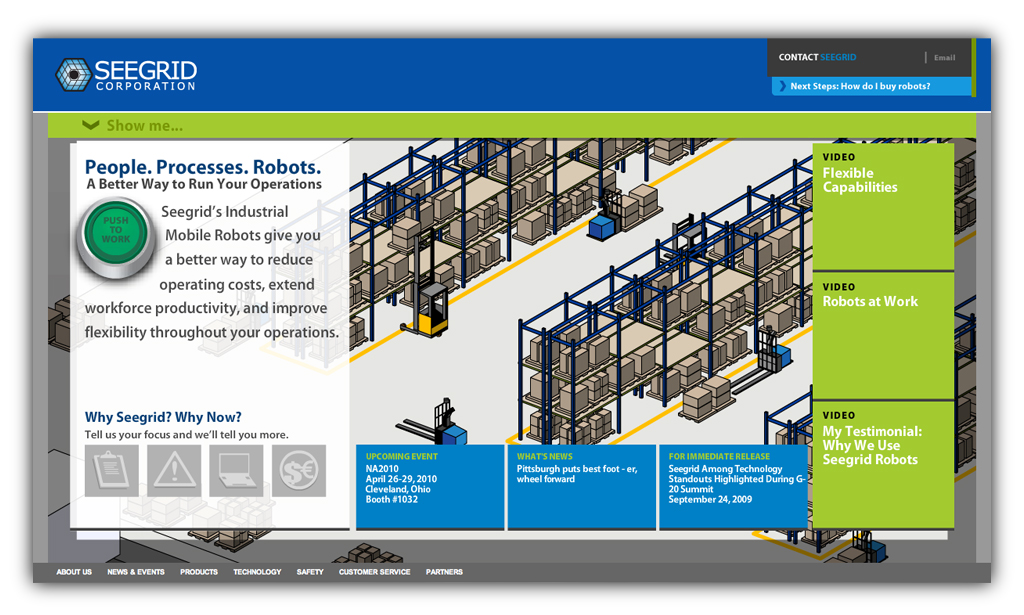 This site was created with one goal in mind... show potential customers how easily this product can be implemented. To accomplish this the site was designed to mimic the behavior of the product. Pressing a large green button on the site started the virtual robotic fork truck on its virtual delivery path just as pressing the same green button on an actual robotic fork truck would start its delivery path.
